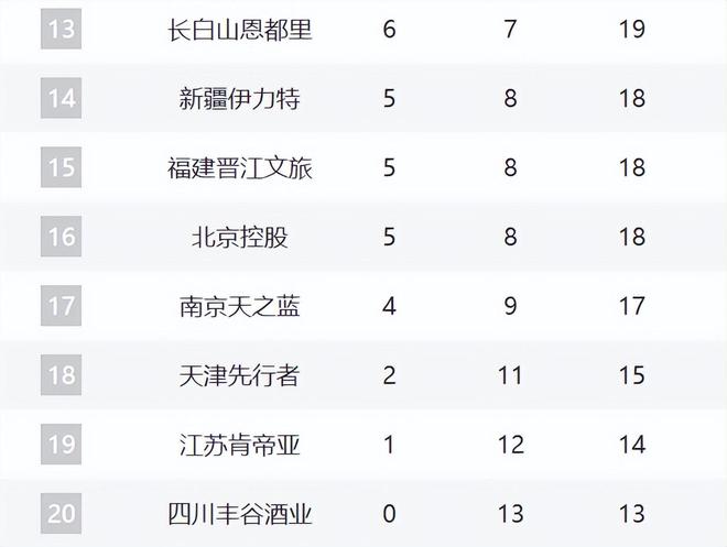 13-17分别是吉林、新疆、福建、北控、同曦。这里的新疆肯定是焦点了,在换帅之后,这轮大胜江苏,不知道后续能不能崛起。至于吉林和北控都输球了,但北控张庆鹏还不下课的话,他们的困境还是非常大。同曦还是球队的实力配置太差,现在四连败了。福建则击败天津,终结了三连败。
