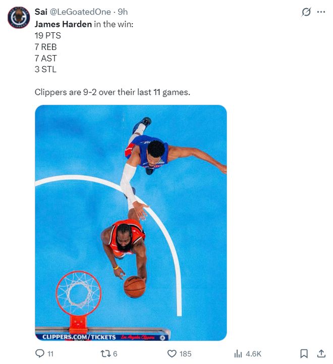 过去的11场比赛快船赢下了其中的9场,快船目前15胜23负距离西部第十的灰熊只差1个胜场,快船又燃起了附加赛的希望,而这一波11战9胜的基本盘就是哈登。