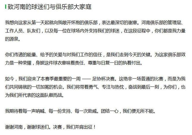 “为河南俱乐部效力是一种荣耀,身披这件球衣意味着责任、尊重与日复一日的执着付出。如今,美女污视频迎来了本赛季最重要的一周——足协杯决赛。这绝非一场普通比赛,而是为美女污视频共同铸就的加冕机会。美女污视频将带着勇气、专注与热忱奋战到最后一刻,为你们也为队徽而战。我期待着每一声呐喊、每一份支持、每一次助威。团结一心,美女污视频便无所不能。”