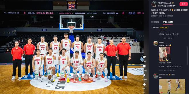 • 贺希宁晒合影庆祝男篮胜利,胡明轩评论:乐邦詹士先生